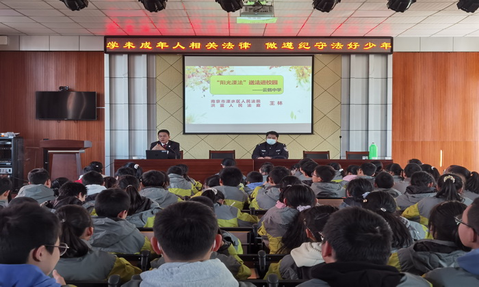 同时,溧水法院洪蓝人民法庭暨关工站成员于近期来到晶桥镇云鹤中学,为全校学生上了一堂主题为《保卫青春 预防犯罪》的法治课。