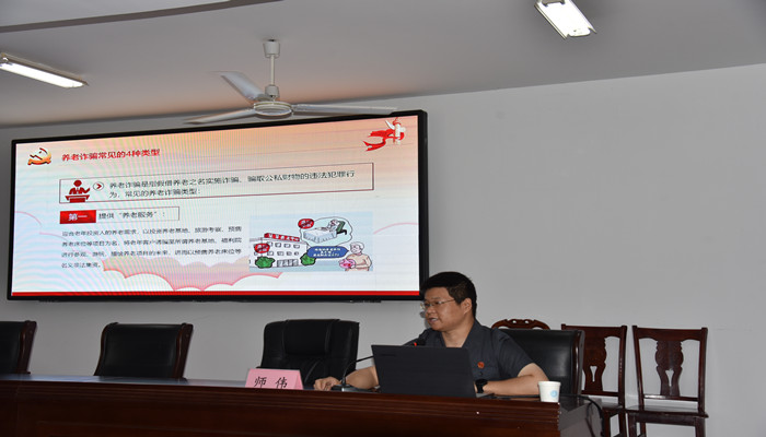 师伟法官结合自身审判工作经验,先是详细介绍了提供“养老服务”、销售“养老产品”、投资“养老项目”、宣称“以房养老”等4种日常常见的养老诈骗套路,然后揭露了“野医游商瞎忽悠”、“广告明星充专家”等购买“保健品”常见的12个陷阱,最后用几句通俗易通的养老诈骗“小提示”提醒大家理性养老,远离养老诈骗。